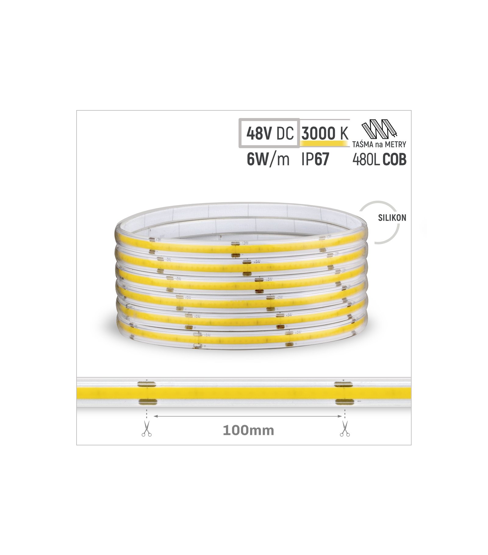 Profesjonalna taśma typu COB, posiadająca 480 diod na metrze. Świeci jednolitą linią światła, bez widocznych punktów !