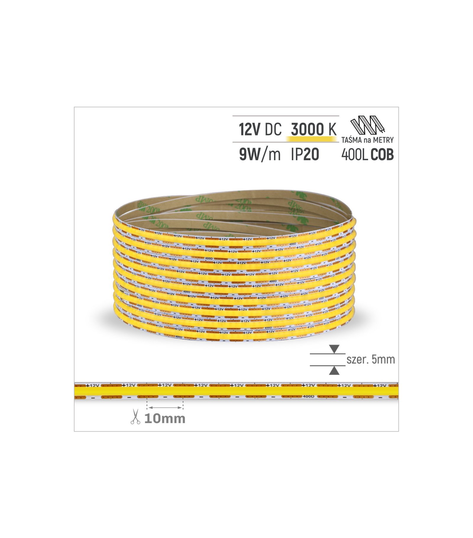 TAŚMA ROL. COB 400LED/MB 5mm IP20 3000K 9W/mb 12V/DC ROL.30M